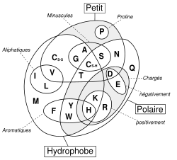 Le complexe ci-contre sans R est nommé radical ou chaîne principale, il est commun à l'ensemble des acides aminés. R représente une chaîne latérale spécifique à chaque acide aminé. Les acides aminés sont généralement classés selon les propriétés de la chaîne latérale en cinq groupes : acide, basique, neutre, hydrophile (polaire) ou hydrophobe (apolaire).